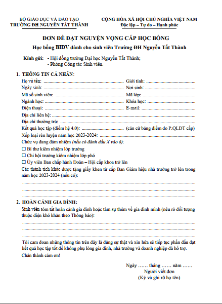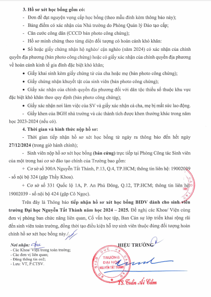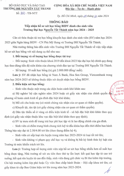 • / Thông báo tiếp nhận hồ sơ xét học bổng BIDV dành cho sinh viên Trường Đại học Nguyễn Tất Thành năm học 2024-2025