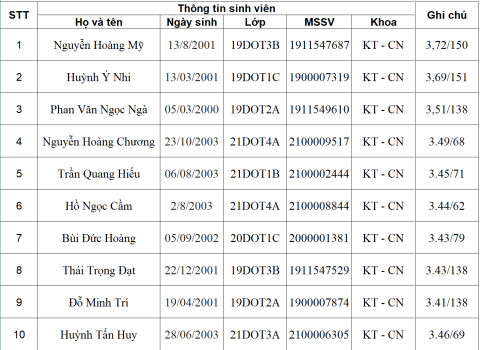 Sau khi cho sinh viên đăng kí và kiểm tra lại, Khoa KT-CN công bố danh sách 10 bạn đạt học bổng: