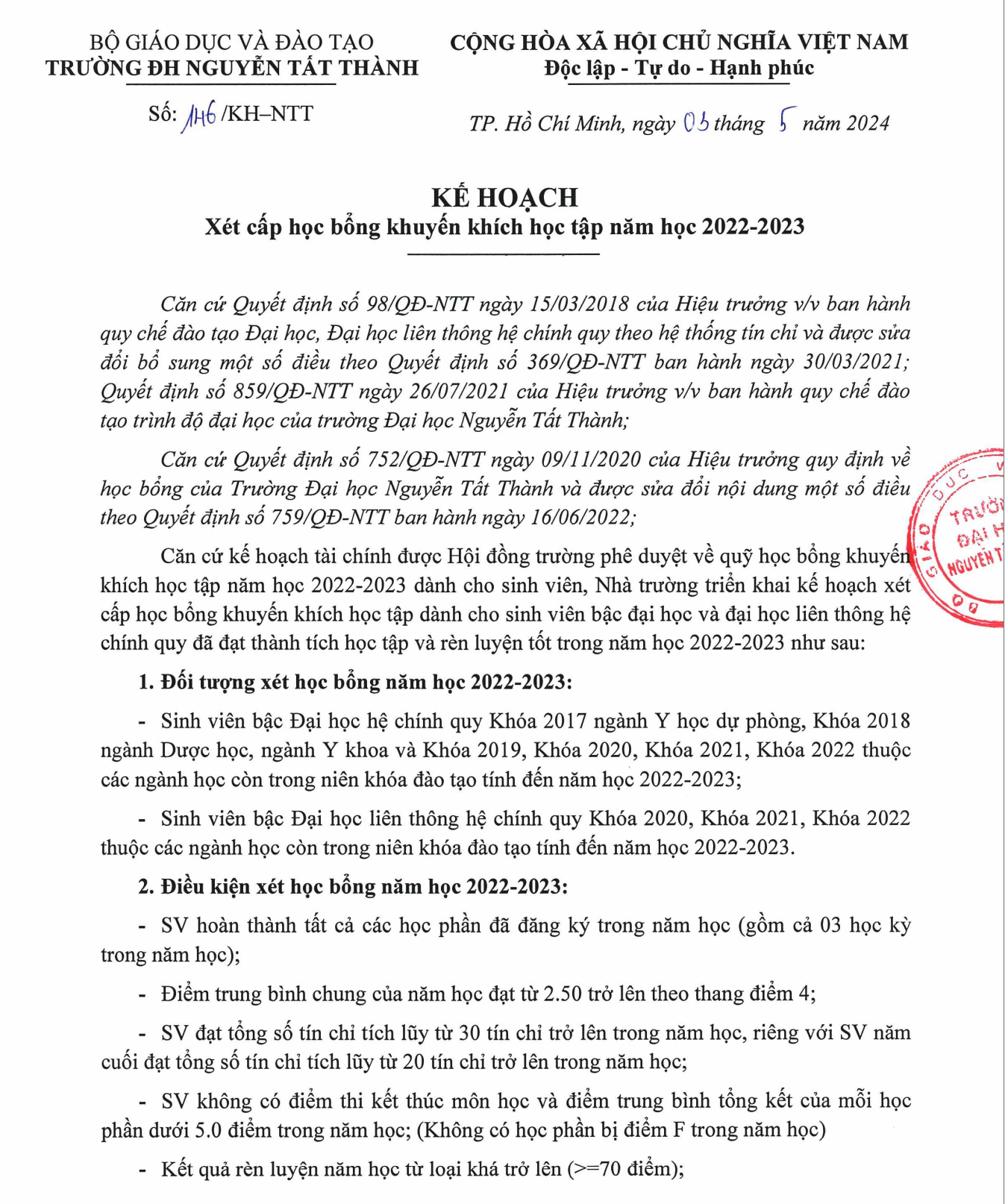 / Kế hoạch xét học bổng năm học 2022-2023 NTTU