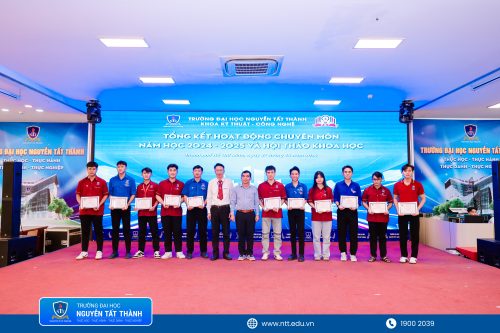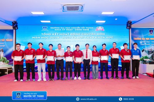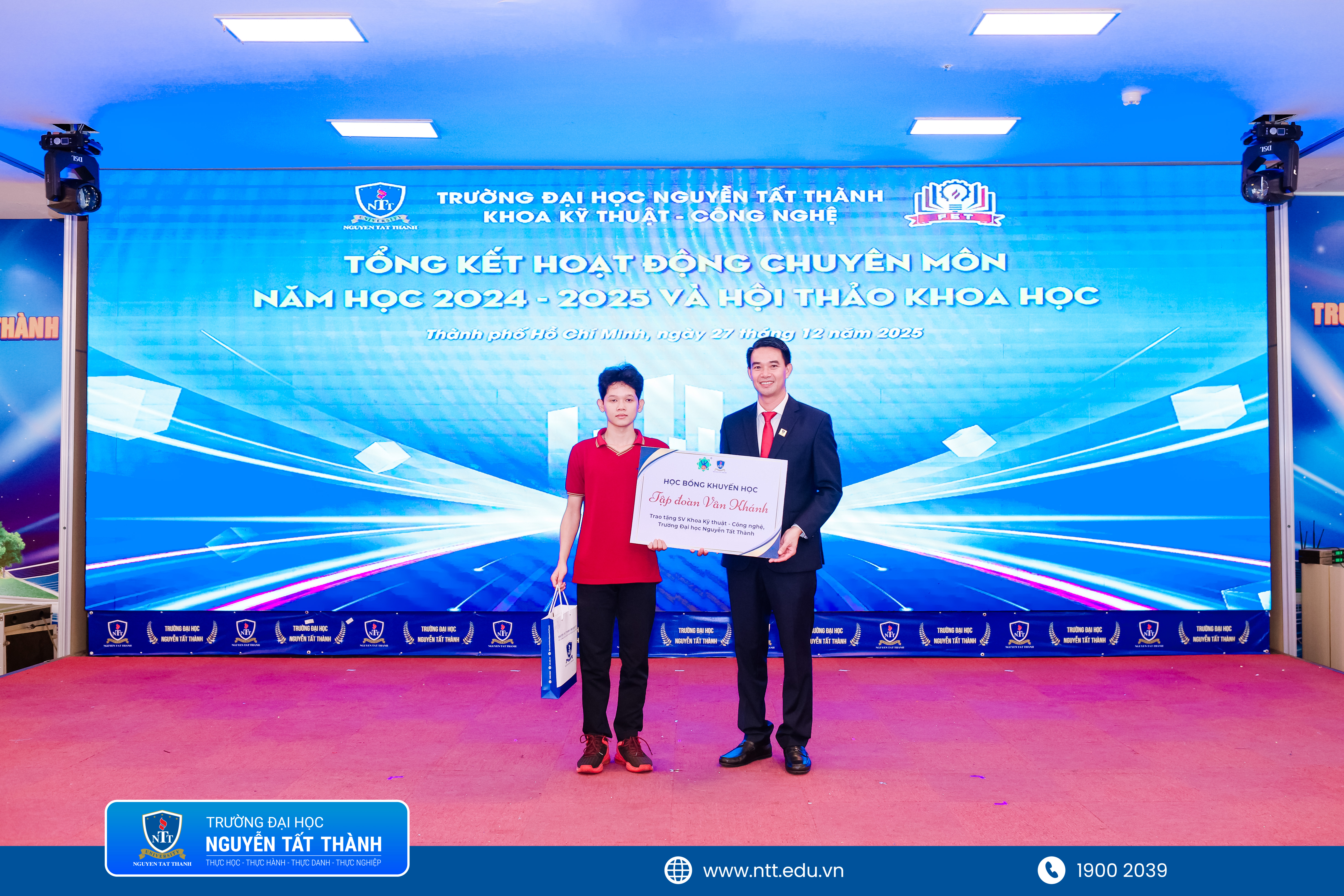 Trong khuôn khổ chương trình Tổng kết hoạt động chuyên môn năm học 2024–2025, Khoa Kỹ thuật – Công nghệ tổ chức trao học bổng cho SV từ sự tài trợ của Tập đoàn Đầu tư – Thương mại và Xây dựng Vân Khánh, đồng thời khen thưởng các sinh viên đạt thành tích học tập xuất sắc, giỏi và tích cực tham gia các hoạt động phong trào