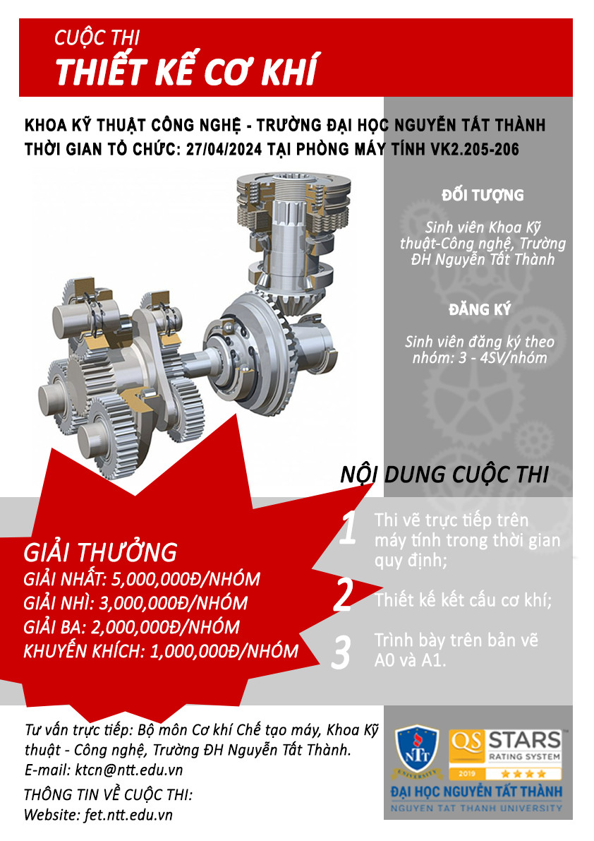 Khoa Kỹ thuật-Công nghệ, Trường Đại học Nguyễn Tất Thành trân trọng thông báo về cuộc thi thiết kế cơ khí dành cho tất cả sinh viên có niềm đam mê và sáng tạo trong lĩnh vực kỹ thuật.