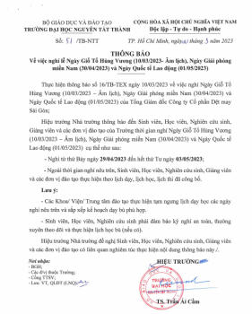Thông báo nghỉ giỗ tổ Hùng Vương và 30/4/2023, 1/5/2023 Trường có thông báo về nghỉ lễ giỗ tổ Hùng Vương và 30/4/2023, 1/5/2023. Chi tiết xem thông báo: