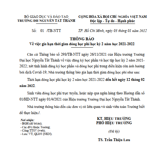 / Thông báo về việc gia hạn thời gian đóng học phí học kỳ 2 năm học 2021-2022