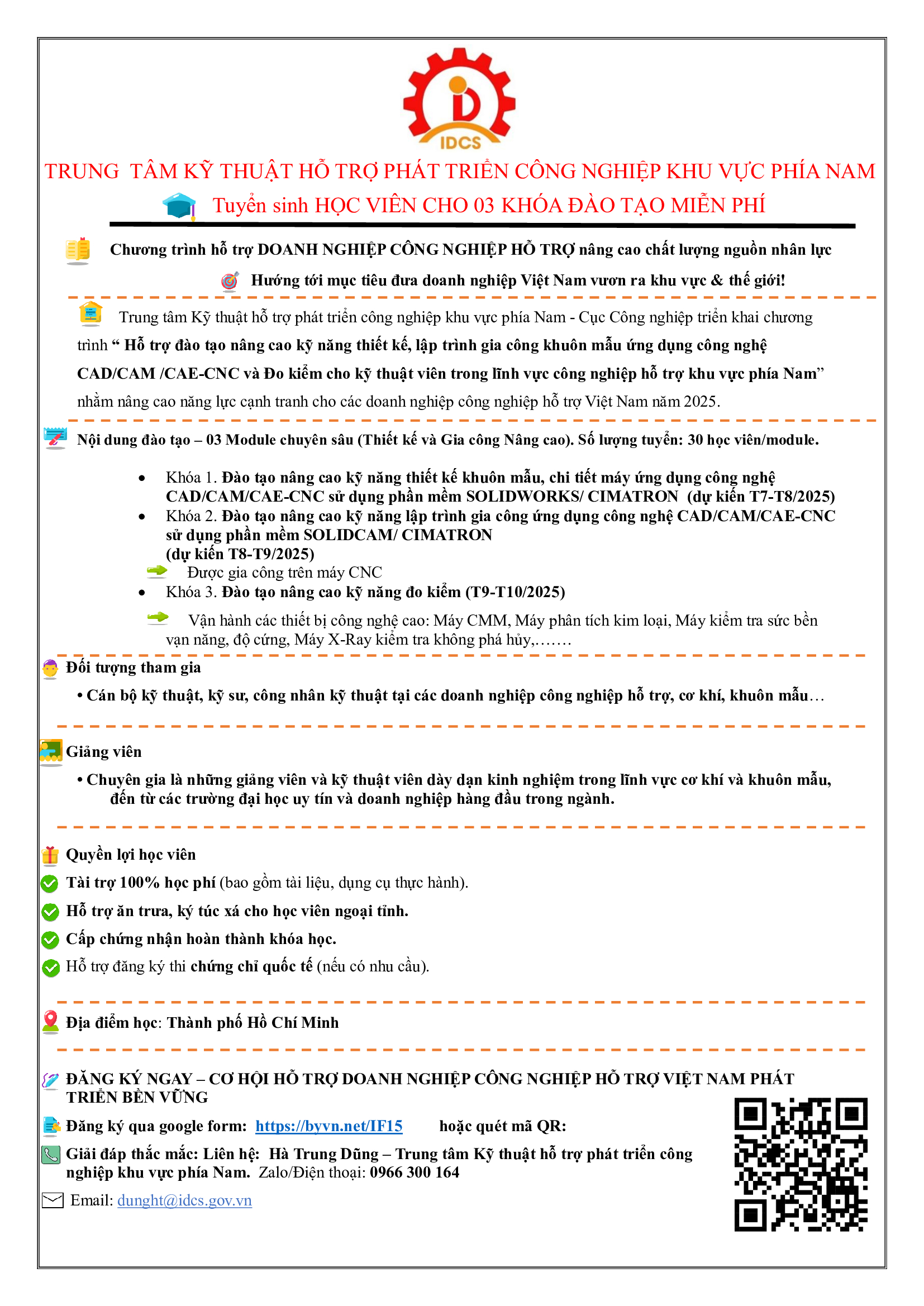 Trung tâm Kỹ thuật Hỗ trợ Phát triển Công nghiệp Khu vực phía Nam (IDCS) – Cục Công nghiệp thông báo tuyển sinh 03 khóa đào tạo nâng cao kỹ năng kỹ thuật công nghiệp hỗ trợ, hoàn toàn MIỄN PHÍ dành cho đội ngũ kỹ thuật viên, kỹ sư, công nhân kỹ thuật tại các doanh nghiệp ngành cơ khí, khuôn mẫu, công nghiệp hỗ trợ.