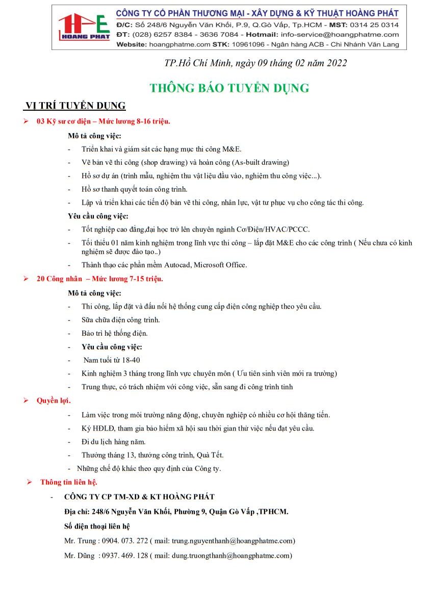 / Công Ty CP TM-Xây Dựng & KT Hoàng Phát tuyển dụng