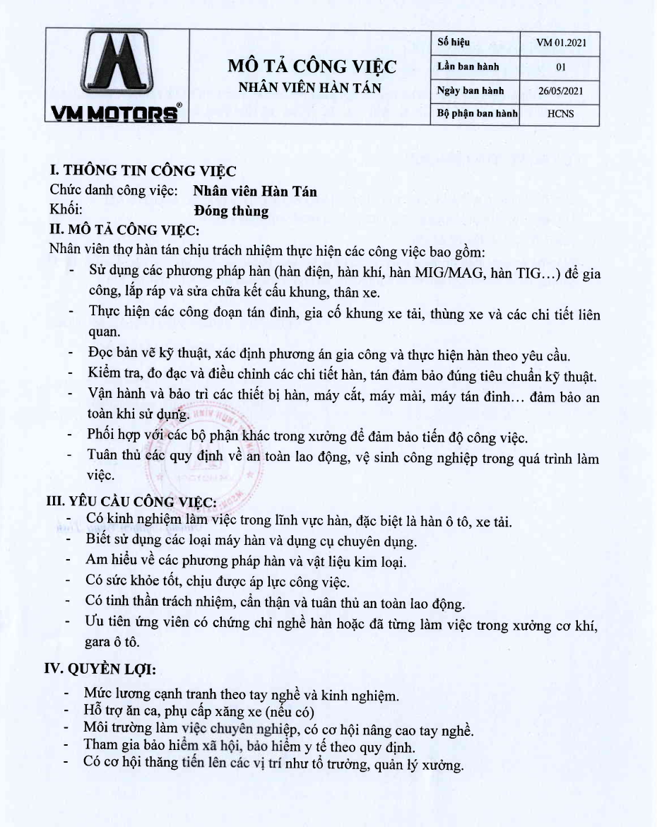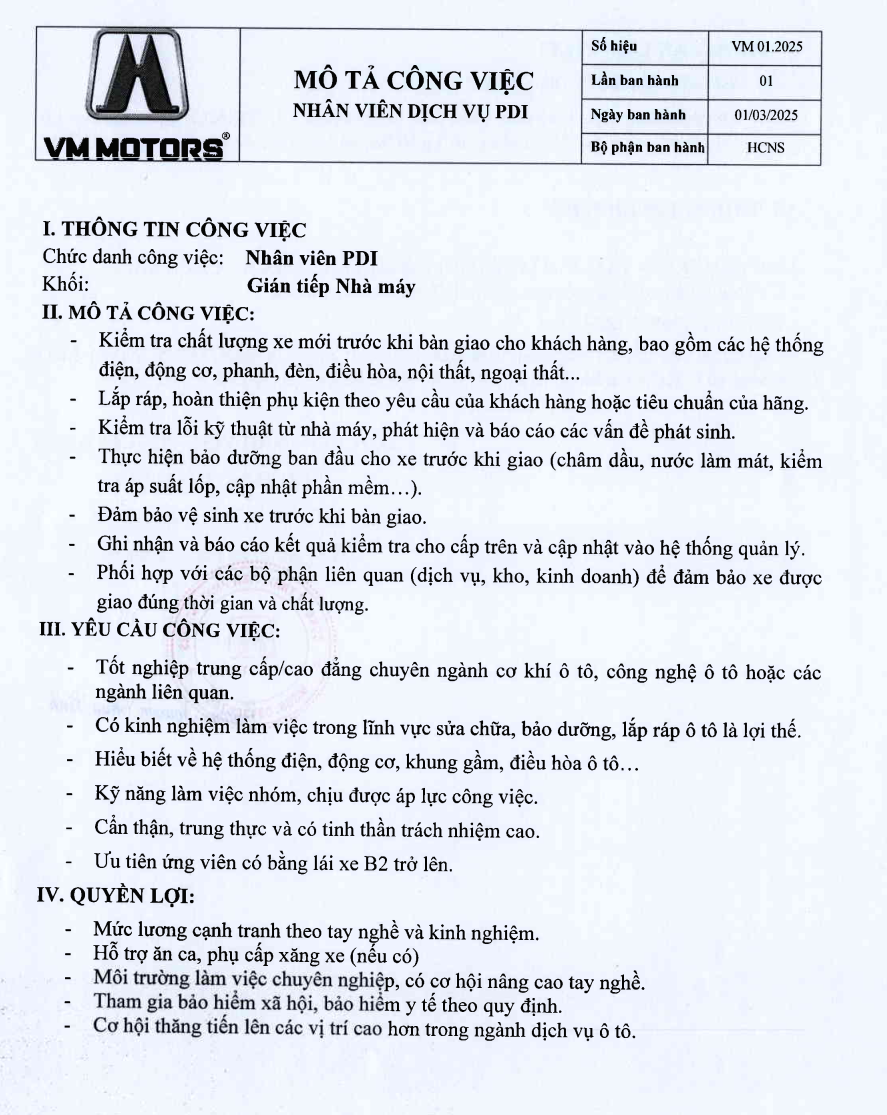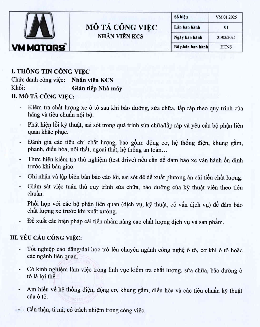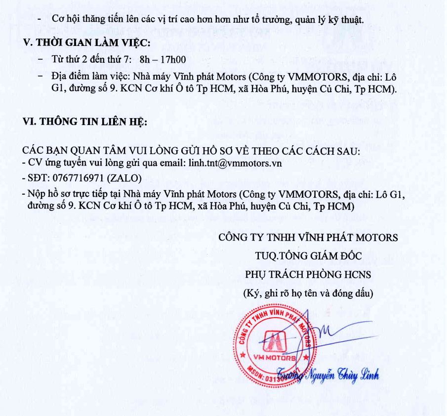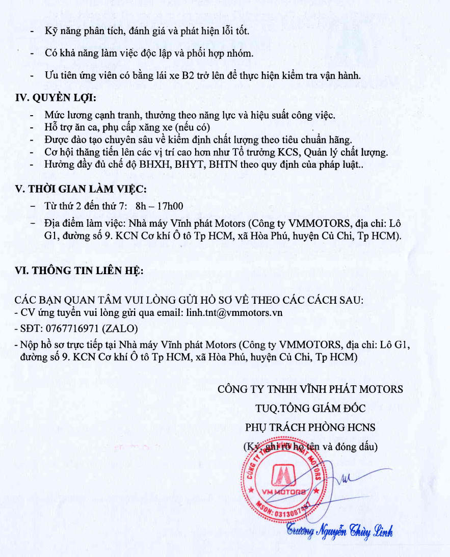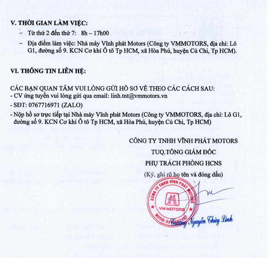 / VM MOTORS THÔNG BÁO TUYỂN DỤNG