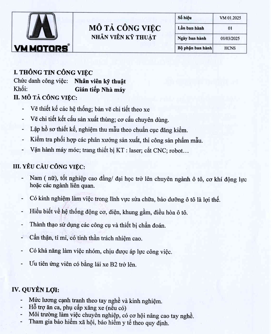 VM MOTORS THÔNG BÁO TUYỂN DỤNG